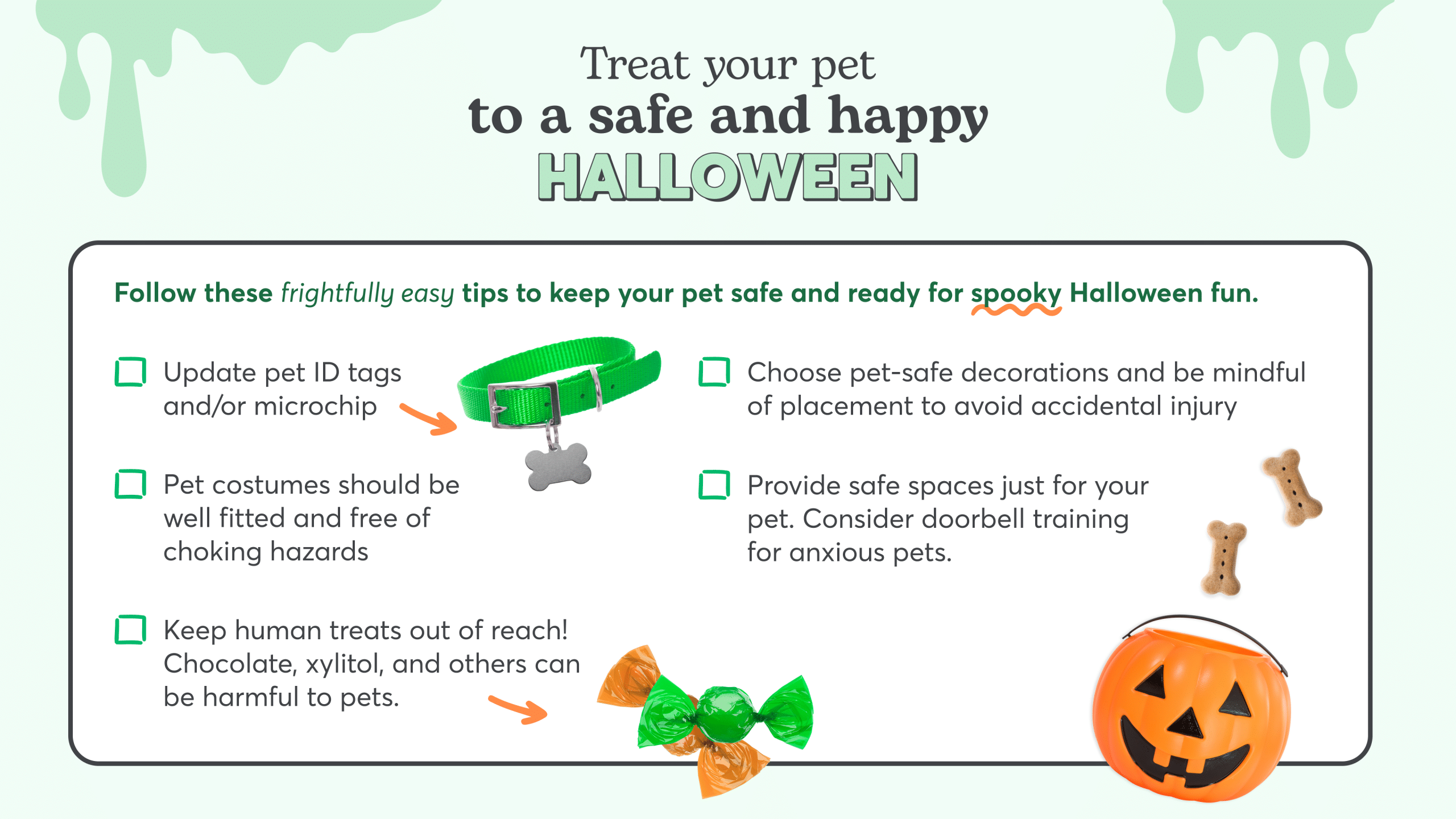 The top concern among pet parents is exposure to potential toxins, with 45% admitting their dog or cat has gotten into the Halloween candy or decor at some point. Tempting treats in combination with excited crowds and strange sounds can be a lot for a pet to handle. In fact, 41% of pet parents wish they had specific tips for keeping their pets calm and content during the chaos of Halloween. See below for Rover’s top Halloween safety tips and check out our comprehensive Halloween safety guide for more – including pet-proofing your home, preventing escapes, choosing appropriate costumes, and managing pet anxiety.
